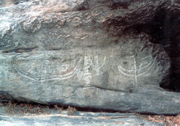 海船石巖畫,位于大山圍兩峰對峙中間突出的山崖上。月牙形的峭壁面積,約五六平方米,攜刻了大小兩只條形的石船,船上的桅桿槳舵,蓬花式的帆衣,依稀可見,線條簡潔、明快。船若飄搖,似動未動,大有乘風(fēng)破浪直上云宵之勢,意為古人欲飛天之舉也。